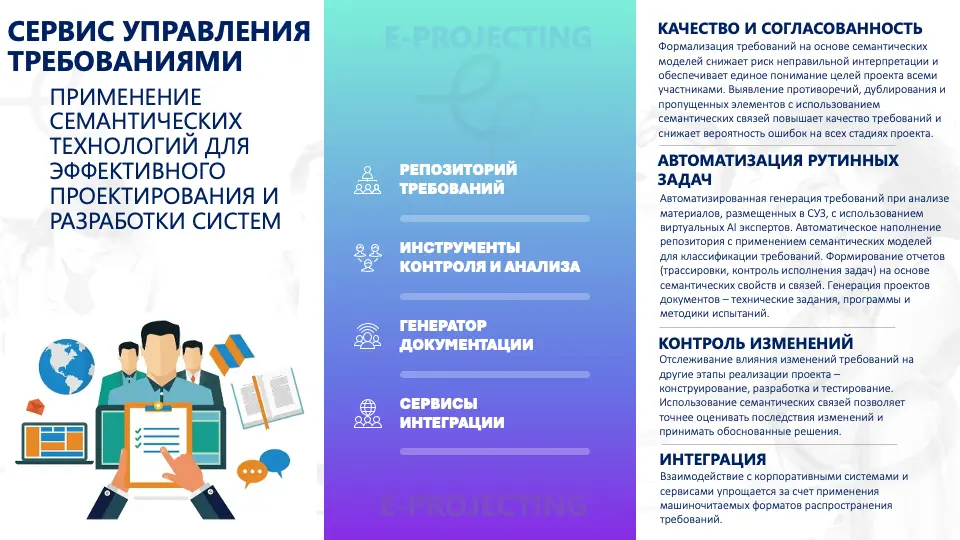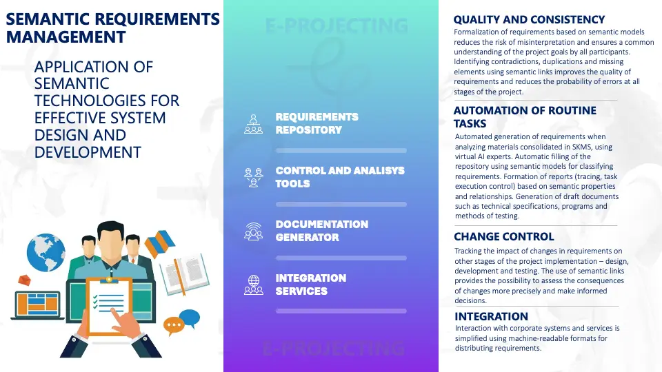 Расширяйте стандартные возможности управления требованиями с учетом их семантического контекста. Применение семантических технологий снижает риски и обеспечивает более точное выполнение задач аналитиков при формулировании, связывании, отслеживании и контроля реализации требований на всех этапах жизненного цикла продукта