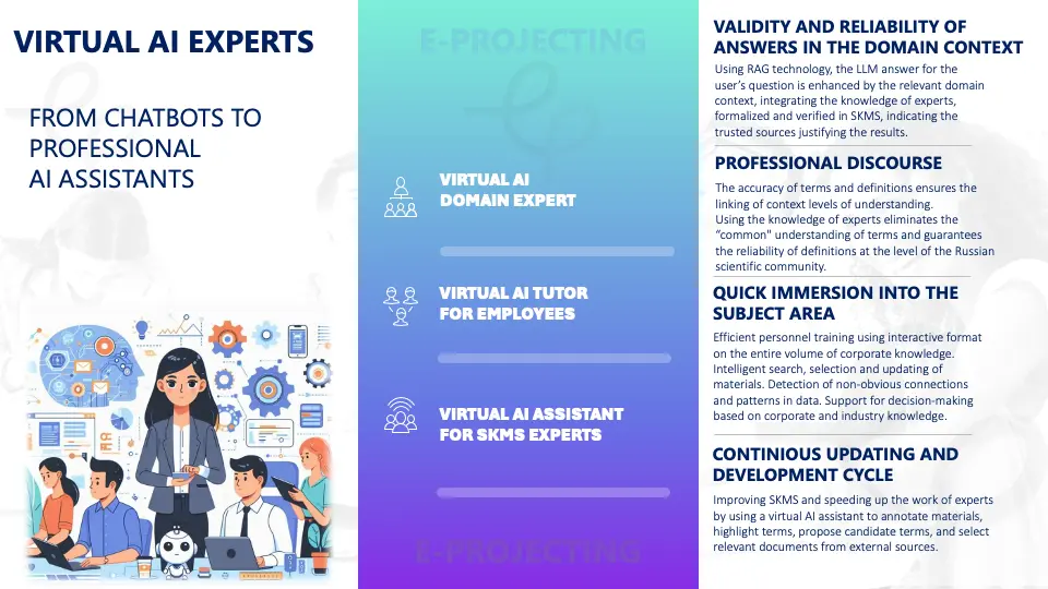 Используйте умных виртуальных экспертов в качестве надежных помощников, повышая эффективность и скорость работы сотрудников. Применение передовых алгоритмов ИИ, персонализированные рекомендации, консолидация экспертных знаний обеспечивают принятие обоснованных решений и реализацию сложных инновационных задач